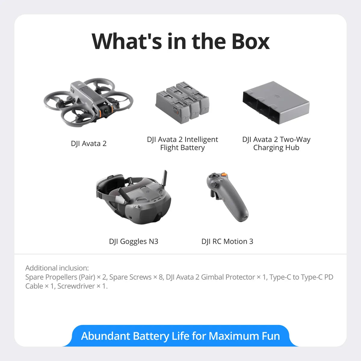 The adrenaline-pumping DJI Avata 2 delivers an immersive FPV drone experience with improved imaging, safety, and battery life. Amp up the fun when you pair Avata 2 with the new DJI Goggles N3 and DJI RC Motion 3.